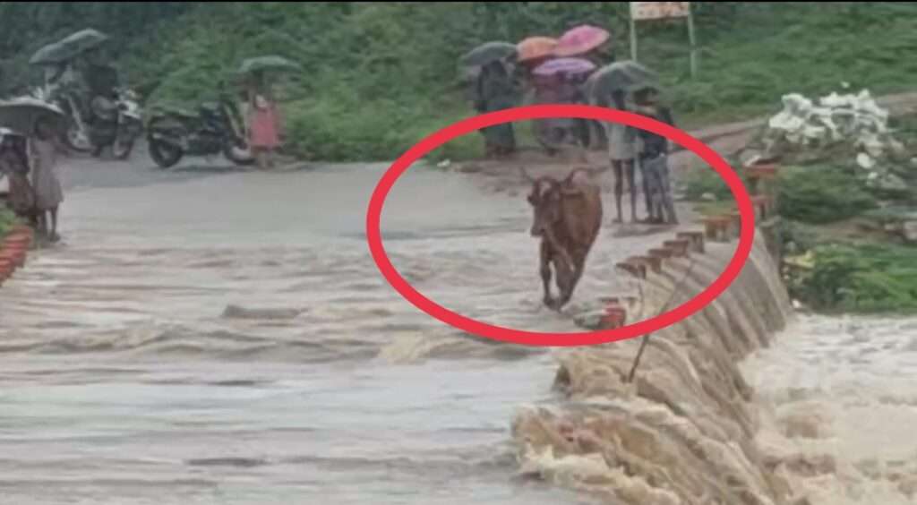 अलीराजपुर । जिले में लगातार दो दिनों से हो रही बारिश के कारण नदी-नाले उफान पर हैं। इसी दौरान राक्सा नदी में एक गाय बह गई। गाय के बहने का वीडियो सोशल मीडिया पर तेजी से वायरल हो रहा है। वीडियो में देखा जा सकता है कि उफनती नदी में गाय तिनके की तरह बह रही है। पुलिया पर पानी के तेज बहाव के कारण मार्ग बाधित हो गया है। इससे कई गांवो का संपर्क जिला मुख्यालय से कट गया है।