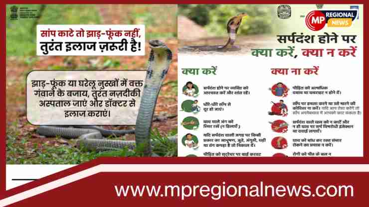 सांप काटते ही तुरंत नजदीकी अस्पताल जाएं और डॉक्टर से इलाज कराएं। आपकी जागरूकता किसी और की जान भी बचा सकती है। MP Regional News आपसे अपील करता है। अंधविश्वास नहीं, आधुनिक इलाज को अपनाएं।